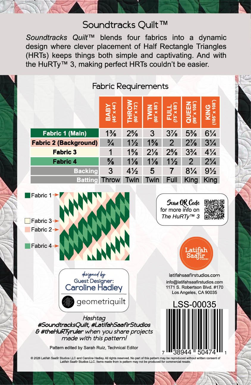Soundtracks Quilt™ turns four fabrics into bold, graphic rhythm. Designed by Caroline Hadley of Geometriquilt, this dynamic pattern uses Half Rectangle Triangles (HRTs) to create diagonal, undulating bands that feel structured, energetic, and visually striking.